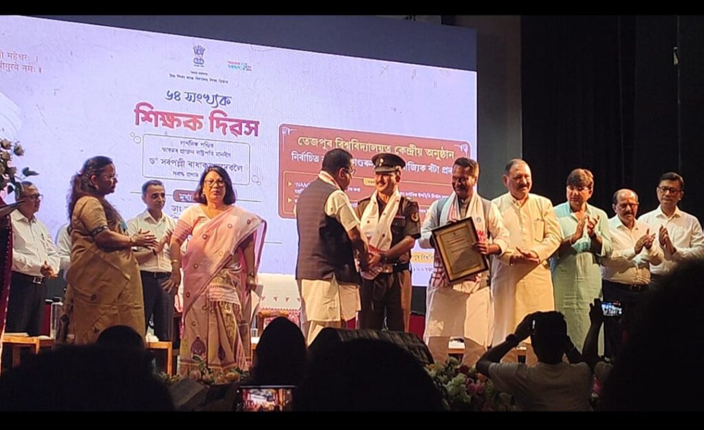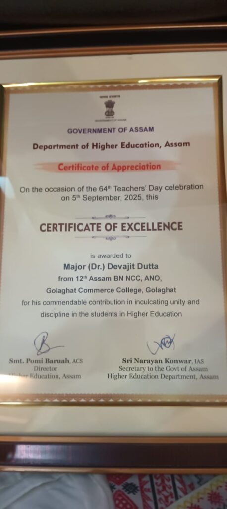 Major (Dr) Devajit dutta, assistant professor of Golaghat commerce College (Autonomous) has received Assam State award on the eve of Teacher’s day in recognition of his outstanding service in the National Cadet Corps (NCC) . This remarkable achievement is a testament to unwavering dedication, discipline and outstanding contribution for the development of the youth through NCC. He received this prestigious Assam State Award from the Honourable Education Minister of Assam Dr Ronuj Pegu on the occasion of Teacher’s day celebration at Tezpur University.